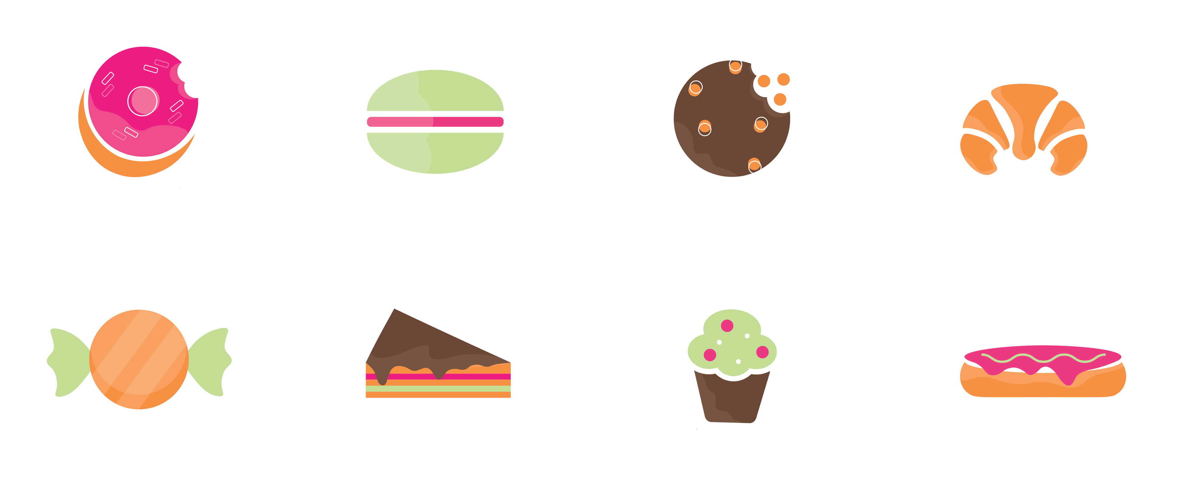 This fictitious bakery brand, Vanilla Delight, is represented with original icons of various bakery sweets. Using lines, circles, and a consistent color palette a unique system of shapes represent these tasty delights.